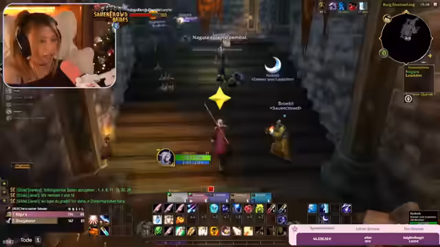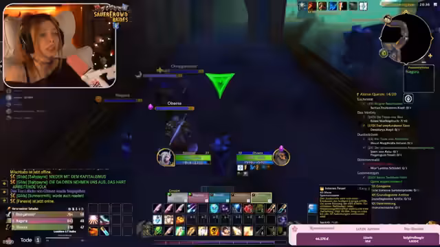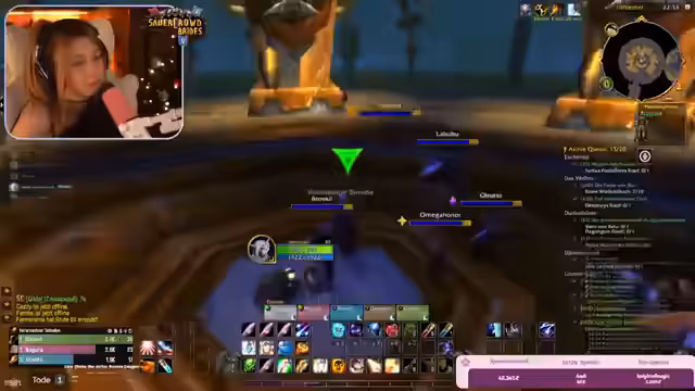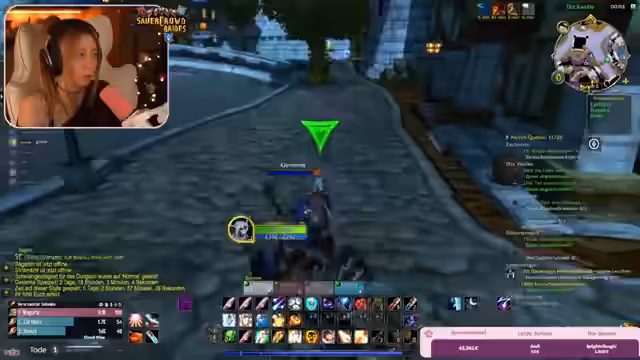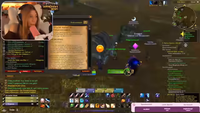 05:45:36Zu Beginn des Streams werden verschiedene Quests im Spiel besprochen und verteilt. Eine Diskussion dreht sich um die Annahme bestimmter Quests und die Erfahrungspunkte (XP). Die Streamerin fragt nach Präferenzen, welche Quests übernommen werden sollen, und plant, Level 30 zu erreichen. Es kommt zu technischen Herausforderungen bei der Annahme von Quests und der Koordination der Gruppe, um die Questgänger zu erreichen und die Gruppe zu portieren. Eine Debatte über die Wahl der richtigen Schild-Ausrüstung mit reduziertem Schaden gegenüber zufallsbasierten Stats wie Parry und Crit entspinnt sich und endet mit der Entscheidung für den zuverlässigeren Schild.