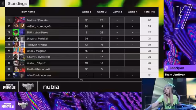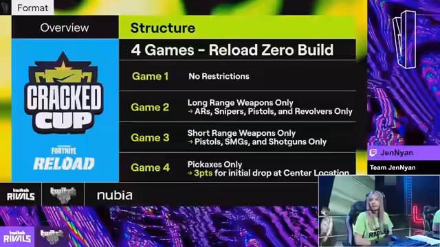 03:43:36Der Wechsel zum offiziellen Livestream der Twitch Rivals Arena findet statt. Kommentatoren stellen die Teilnehmer, darunter Levin, Ruby und Mini, vor. Es wird das Format des Turniers erläutert: 40 Spieler in 20 Duos, Fortnite in einem Zero-Build-Modus mit unterschiedlichen Spielmodi in jeder Runde. Die Punktevergabe wird erklärt, wobei ein Victory Royale 15 Punkte einbringt. Die Commentatoren analysieren die Teilnehmerfelder und heben die hohe Konkurrenz und die aufregende Atmosphäre hervor.