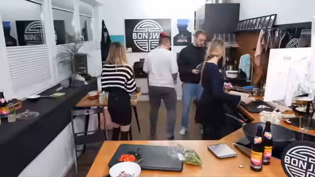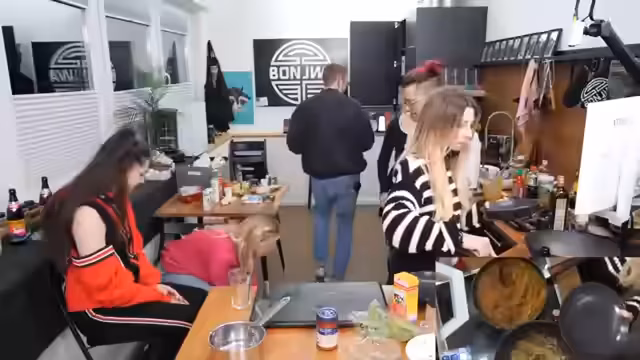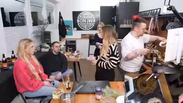 01:55:57Sonja trifft ein und wird herzlich begrüßt. Es wird gescherzt, dass sie und Kaddi sich mit ihren Outfits abgesprochen hätten. Sonja wird nach ihren Kochideen mit den vorhandenen Zutaten gefragt und schlägt eine asiatische Pfanne vor. Es wird überlegt, ob Tortilla-Wraps eine Option wären. Marcel wird gebeten, den Reis in das kochende Wasser zu geben. Es wird diskutiert, ob man Champignons roh essen kann. Währenddessen wird der Tofu in Stärke gewendet und angebraten. Es entsteht ein Gespräch über das WG-Feeling und die Möglichkeit, eine WG zu gründen, was jedoch von einer Person abgelehnt wird. Es wird über frühere Online-Erfahrungen gesprochen, wie das Spielen von Werwolf und Mafia auf Knudels, sowie das Bewerten von Bildern nach Hotness. Es wird über Geld ausgegeben für Emotes in Spielen wie Goose Goose Duck gesprochen. Die kleine Pfanne wird gegen eine größere ausgetauscht, und es wird über die Kochzeit von Reis diskutiert. Sonja berichtet von ihrem 15-Minuten-Reiskocher, während eine andere Person einen japanischen Reiskocher besitzt, der 60 Minuten benötigt. Es wird über die Wahl des Sitzplatzes diskutiert, wobei jede Person eine bevorzugte Seite hat. Eine negative Nachricht über die Nase wird erwähnt, die in einem Bildartikel auf Instagram veröffentlicht wurde. Es wird über Nageldesigns gesprochen und ob man zur Nagelfrau geht oder sich die Nägel selbst aufklebt.