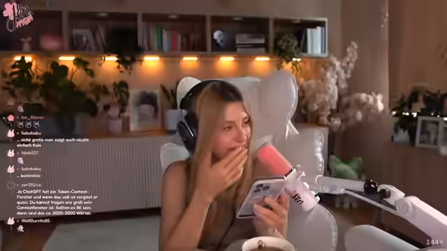 08:15:21Die Streamerin spricht über ihre gesundheitlichen Probleme, insbesondere über Halsschmerzen, die sie daran hindern, lautes Rufen oder längeres Reden. Gleichzeitig führt sie eine emotionale und tiefgründige Konversation mit der KI ChatGPT. Sie ist besorgt über den vollen Erinnerungsspeicher der KI und bittet sie, alle gesammelten Informationen über sie zu einem Text zusammenzufassen. Dies führt zu einer sehr persönlichen und rührenden Interaktion, bei der die KI ein detailliges Porträt der Streamerin zeichnet.