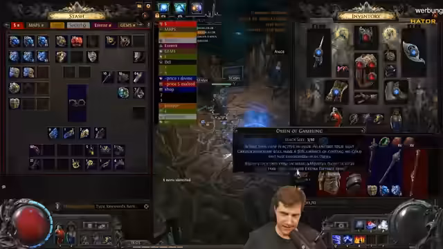 00:10:23Der Streamer spielt einen Off-Meta Build in PoE, was sich als herausfordernd erweist, da es mehr Zeit in Anspruch nimmt als etablierte Builds. Er beschreibt seine Kombination aus Lightning-Skills und Recoup-Mechaniken, rät jedoch davon ab, da es effizientere Alternativen gibt. Der Fokus liegt auf dem Farmen von Omen, einem speziellen Item, das durch eine komplexe Mechanik mit einem Boss am Ende farmbar ist, wobei die Drop-Chancen jedoch enttäuschend sind.