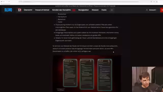 01:48:38Die Hauptfeatures der kommenden Season 10 werden erläutert. Das zentrale Element ist die Chaos-Rüstung, die es ermöglicht, einzigartige Item-Effekte auf anderen Rüstungsteilen zu finden und so neue Ausrüstungskombinationen zu ermöglichen. Ergänzt wird dies durch eine Überarbeitung der Infernal Horden, die mit neuen Monstern und Bossen sowie durch Chaos-Rifts, die zusätzliche Monster spawnen, intensiver gestaltet sind.