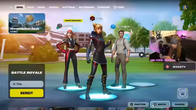 00:03:26Nachdem Jessie die Streamer Magican16 und Johnsy im Chat erwähnt hat und sich über deren Namen gewundert hat, geht es um die technische Vorbereitung. Die Streamer müssen sich erst einspielen, wobei der Blitz-Royale-Modus hierfür als ideal angesehen wird. Jessie bemerkt, dass ihr Desktop voller YouTube-Aufnahmen ist und muss kurz ihre Musik leiser drehen. Die Namen der Teammitglieder im Chat sind oft verwirrend und schwer zu merken, was zu einigen Diskussionen führt. Es wird deutlich, dass die Jungs heute sehr wilde Challenges aufnehmen werden.