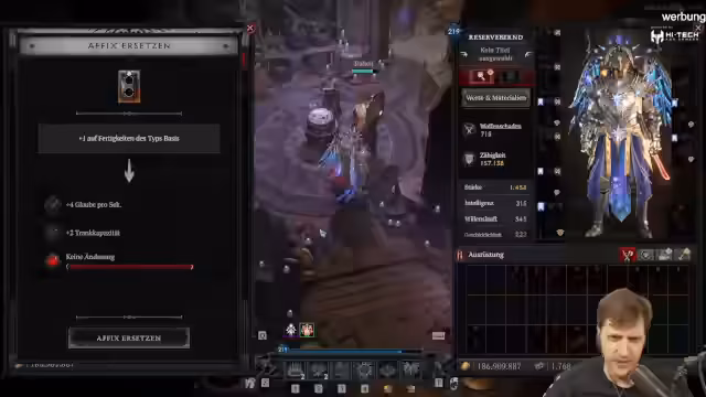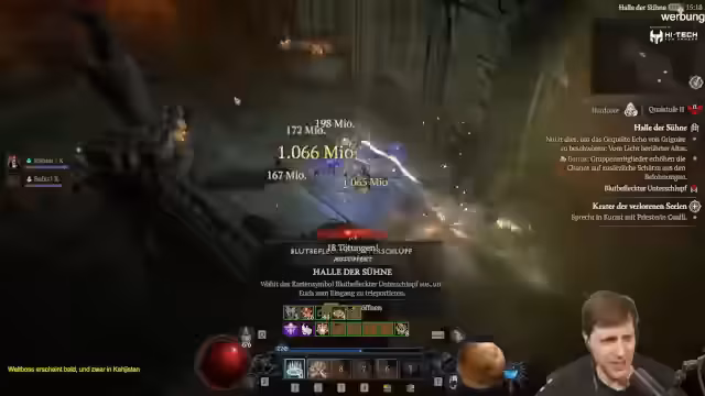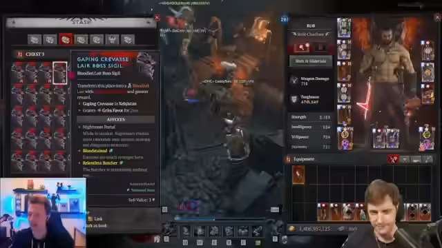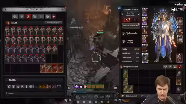 04:00:31Im Rahmen des Streams wird der Boss des Pit-Labyrinths, der Blutbischof, in der Stufe 86 angegangen. Die Zähigkeit des Charakters, die hauptsächlich durch Tyraels Brustplatte und einen Modifier auf dem Schild erreicht wird, wird auf über 600.000 geschätzt. Dennoch werden erhebliche Bedenken geäußert, ob diese ausreicht, um Instant-Tode durch Explosionen zu verhindern. Nach dem erfolgreichen Kampf wird der Fokus auf die Glyphen gelegt, mit dem Ziel, diese für zukünftige Pushes auf 80 und 90 zu optimieren.