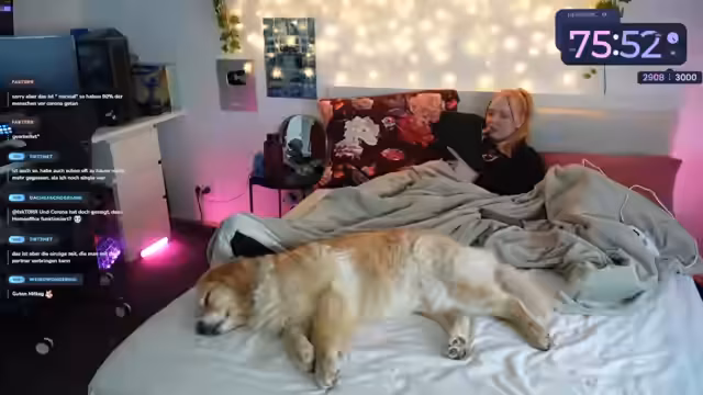 01:46:32Die Streamerin spricht über den Wunsch nach einem weiteren Hund, der jedoch vom Partner abgelehnt wird, und diskutiert mögliche Gründe und Lösungen. Sie betont die Bereicherung, die Holly in ihr Leben bringt, und die Angst vor der Zeit, wenn Holly nicht mehr da sein wird. Es wird die Wichtigkeit betont, Kompromisse zu finden und das Leben nicht durch unnötige Einschränkungen zu belasten. Die Streamerin berichtet von der Schwierigkeit, neben Hauptjob, Minijob und Selbstständigkeit Zeit für den Hund zu finden, betont aber, dass die gemeinsame Zeit ihre "Me-Time" ist. Sie äußert ihre Freude über die Routine des Gassi-Gehens und die Hundeaugen von Holly. Nach dem Spaziergang werden Vorbereitungen für die Fortnite-Aufnahme getroffen, einschließlich Bett machen und Gaming-PC einschalten. Die Streamerin erwähnt, dass sie sich möglicherweise noch umzieht, da es warm ist, und lobt ihre Heizdeckel. Es wird die bevorstehende Aufnahme um 14:30 Uhr angekündigt, und die Streamerin entschuldigt sich für die Verspätung, verspricht aber pünktlich zu sein. Abschließend werden Alexa-Befehle gegeben, um die Beleuchtung einzustellen, und die gekühlten Cookies für später erwähnt.