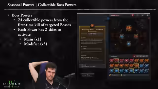 05:28:34Der Stream beginnt mit der Vorstellung des neuen Boss-Power-Systems, das eine klare Progressionsleiter für das Endgame darstellt. Spieler kämpfen sich durch verschiedene Boss-Typen – von Apparition- bis zu World-Bossen – und sammeln deren mächtige Kräfte. Jeder Boss hat eine einzigartige Fähigkeit, die als Talent in speziellen Slots ausgerüstet werden kann. Dieses System, das sich an das Hexen-System der vorherigen Season anlehnt, soll den Weg vom Null-Helden bis hin zum Sieg über Lilith strukturieren und dabei für klare Ziele sorgen.