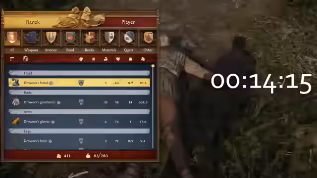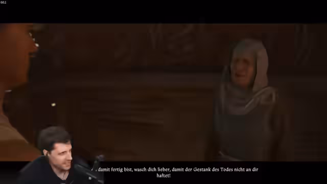 00:03:40Nachdem der Streamer den halb vergrabenen Ranjek im Mist der Taverne entdeckt hat, zieht ihn aus dem Loch. Die Suche nach seiner Identität endet abrupt, als Ranjek während der Rettung stirbt. Der Streamer plündert den Toten, nimmt dessen Bogen und begräbt ihn dann erneut. Dieser zwangsläufig und brutale Anfang verdeutlicht den realistischen und unromantischen Ansatz des Spiels, in dem Aktionen wie das Begraben von Leichen schmutzig machen und Konsequenzen haben.
