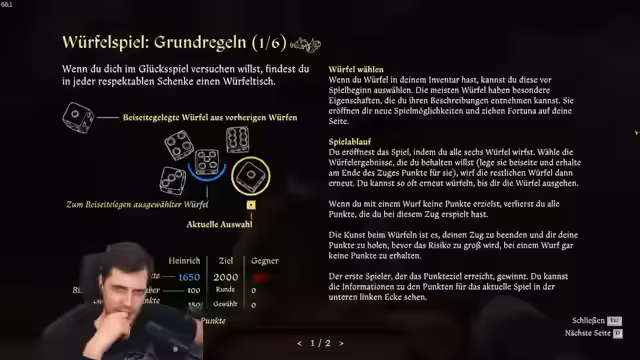 02:26:49Im Verlauf der Geschichte trifft der Streamer auf eine Gruppe von Banditen, die er durch geschickte Dialoge mit seinen Charisma-Attributen beruhigen und abwehren kann. Anschließend quartiert er sich mit seiner Gruppe für die Nacht ein. Er interagiert mit den Charakteren, indem er den Hund Heinrich füttern muss und dabei in ein Würfelspiel mit einem Soldaten verwickelt wird, das er nach anfänglichen Schwierigkeiten gewinnt. Diese Interaktionen verdeutlichen die tiefgreifenden und die Story beeinflussenden Dialogoptionen des Spiels.
