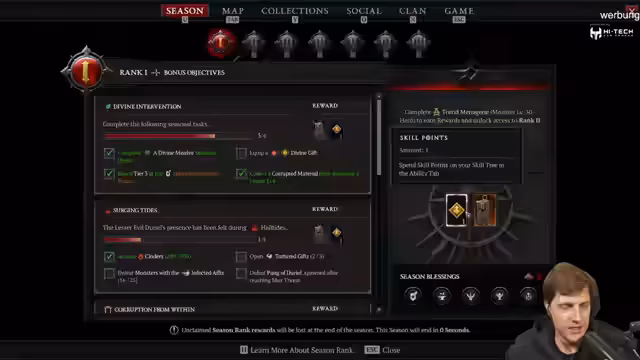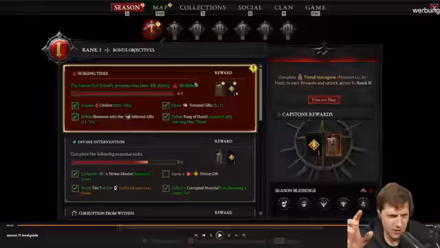 02:47:09Die bevorstehenden Änderungen in Diablo 4 Season 11 werden detailliert besprochen. Es wird angekündigt, dass Skillpunkte nicht mehr automatisch vergeben werden, sondern über ein neues Season-Rank-System freigespielt werden müssen. Dies führt dazu, dass Spieler im Level-Part "deutlich schwächer" sein werden als in früheren Seasons. Der Streamer empfindet dieses System als besser und "frischer", da es einen Leitfaden durch Diablo bietet. Eine weitere wesentliche Änderung ist die Rückkehr von sechs Capstone Dungeons, die nicht mehr ausgelassen werden können und jeweils etwa eine halbe Stunde in Anspruch nehmen. Es wird empfohlen, diese Dungeons überlevelt anzugehen, um Frustration zu vermeiden, da sie als "Krampf" beschrieben werden. Die Bosse in den Capstones sollen jedoch weniger Leben haben. Zudem kommt in Season 11 Duriel bei den Helltides anstelle der Maiden, was in der Testphase aufgrund des hohen Giftschadens der Maden und der geänderten Zähigkeitsberechnung zu Problemen führte. Dies ist auch der Grund, warum für Season 11 ein Softcore-Event anstelle eines Hardcore-Events geplant ist, da der Hardcore-Modus aufgrund dieser Änderungen "null Spaß" machen würde.