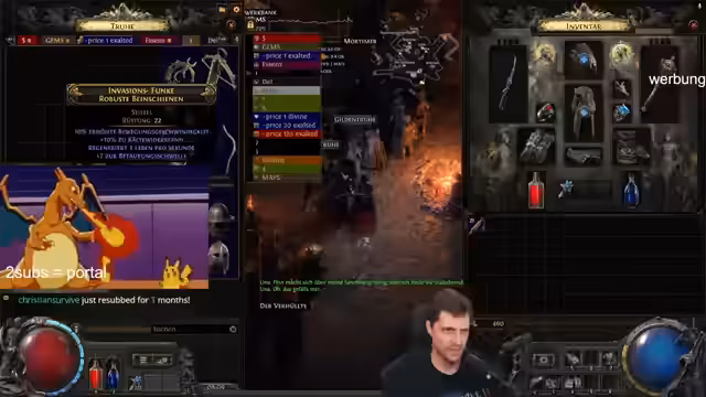 00:05:51Der Stream beginnt mit einer humorvollen Auseinandersetzung der Streamerin mit einer Spinne auf der Tastatur. Um 5 Uhr früh wird das Farmen im Spiel Path of Exile gestartet. Die Streamerin stellt ihren geplanten Infernalist-Build vor und wird von technischen Problemen wie einer großen Spinne auf der Tastatur unterbrochen, die sie als "Weberknecht" bezeichnet und wegschafft. Der Stream wird von der Farm-Aktivität dominiert, bei der die Streamerin nach neuen Ausrüstungsgegenständen sucht.