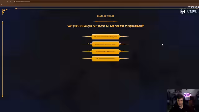 01:59:25In fünf Minuten startet das mit Spannung erwartete Volksquiz für die WoW Hardcore Challenge. Jesse Rocks äußert seine Vorfreude, aber auch die Befürchtung, dass das Quiz, ähnlich wie ein früheres Diablo-Story-Quiz, herausfordernd sein könnte. Er hofft, dass es keine tiefgreifenden WoW-Story-Inhalte abfragt und dass er am Ende keinen Gnom zugewiesen bekommt. Das Quiz umfasst 32 Fragen und wird als 'Todesanstrengend' beschrieben. Nach einer Reihe von Fragen zu Humor, Unordnung, Konfliktbewältigung, persönlichen Bedürfnissen, Lebensschwierigkeit, Charakter-Customization, Stellvertreterwahl, Müdigkeitsreaktionen, Gedankenformen, Entscheidungsfindung, Rhythmusgefühl, Stressreaktionen, Entscheidungen unter Informationsmangel, Stream-Stressoren, Ärgerfaktoren, Sitzplatzwahl, Stream-Planung, Tagesbeginn, persönlicher Beschreibung, Planänderungen, Streaming-Equipment, Zeitgefühl, Umgang mit Open Worlds, Alltagsoptimierung, Jahreszeitenpräferenz, Schwächen, Momenten des 'Sich-selbst-Fühlens' und Tintenklecks-Interpretationen, wird das Ergebnis enthüllt: Jesse Rocks wird ein Mensch für das World of Warcraft Hardcore Event. Die Community spekuliert über die Stärke dieser Wahl und die potenziellen Leader der Menschenrasse, wobei Metashi und Enno als mögliche Kandidaten genannt werden. Das Event startet am 27. Dezember um 12 Uhr.