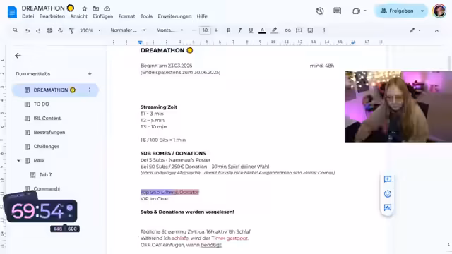 04:23:53Es wird angekündigt, dass in der nächsten Woche viel Zeit zum Zocken eingeplant ist, mit dem Ziel, 69 Stunden und 21 Minuten zu streamen. Ein Team-MVP wird hervorgehoben und in die nächste Runde mitgenommen. Es wird nach dem Gesundheitszustand eines Zuschauers gefragt und die bevorstehende Sommerthon erwähnt, für die viel Valorant geplant ist. Es wird über die Möglichkeit gesprochen, wieder arbeiten zu gehen, um einen Tagesrhythmus zu haben. Leichte Horrorspiele sollen in das Bestrafungsrad aufgenommen werden. Die Zuschauer äußern den Wunsch nach Horrorfilmen im Stream. Es wird überlegt, das Rad der Bestrafung doch bei 2500 zu belassen. Es wird überlegt, den Timer-Command in den Titel hinzuzufügen, um zu erklären, wie sich der Timer durch Subs und Spenden verlängert.