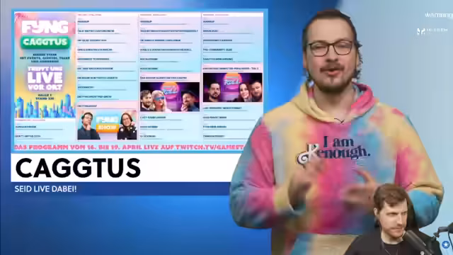 01:52:38Der Streamer informiert über die GameStar Präsenz auf der Cactus Gaming Messe in Leipzig, beginnend am Freitag um 10 Uhr. Er hebt zwei Highlights hervor: die große Find Your Next Gameshow am Freitag mit 20 Trailern und Weltpremieren, sowie das GameStar Pen & Paper Grand Theft Cactus am Samstag und Sonntag. Er erwähnt auch andere geplante Inhalte wie Metro, Die Gilde und Spiele erraten.