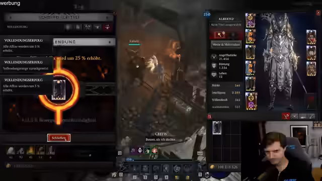 00:22:11Der Stream startet mit einer Begrüßung der Zuschauer für die letzte Runde des Live-Streams. Der Streamer beginnt mit dem Ausrollen von Waffenstats in einem Spiel, wahrscheinlich Diablo 4, und versucht, eine bestimmte Waffe mit Hydra-Schaden zu verbessern. Nach mehreren Versuchen gelingt es ihm, eine Waffe mit drei Hydra-Treffern zu erhalten, was als extrem glücklicher Durchbruch bezeichnet wird.