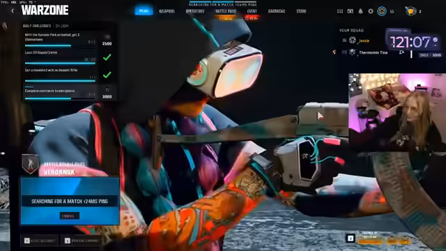 16:02:59Der Streamer spielt Warzone in einem Duo-Squad, nachdem sein Partner Jay zu spät kommt. Er kritisiert seinen Tobi als zwar sympathisch, aber todesunzuverlässig. Er lobt seine aktuelle Waffe, die Amex, als todes-sisi, besonders im Vergleich zur Kilo, die ihn enttäuscht hat. Er berichtet auch von technischen Problemen wie Twitch-Verbindungsabbrüchen und Game-Crashes.