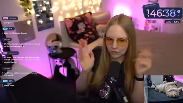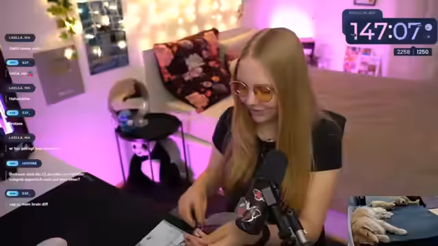 05:09:24Die Streamerin bereitet sich auf den weiteren Stream vor, indem sie ihre Technik überprüft und einstellt. Sie deaktiviert verschiedene Kameras und Mikrofone, um die Qualität zu verbessern. Auch spricht sie über die Musik, die sie im Hintergrund laufen lässt, und passt die Lautstärke an. Dabei zeigt sie sich professionell und sorgt dafür, dass die Zuschauer ein optimales Erlebnis haben. Auch erwähnt sie ihre Katze Holly, die sich währenddessen in ihrem Hundebett ausruht.