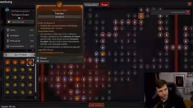 03:49:49Es wird eine technische Unterbrechung angekündigt, während die Streamerin eine Setup-Anpassung vornimmt und für fünf Minuten Pause geht. Danach widmet sie sich einem komplexen Umbau ihrer Ausrüstung, insbesondere dem Wechsel von einer Chaos-Rüstung zu einer mythischen Brustplatte. Dies erfordert eine Neubewertung der Statistiken und Passivpunkte. Sie diskutiert die Vor- und Nachteile des Umbaus und den möglichen Schadensverlust, was den finalen Entscheidungsprozess umständlich macht.