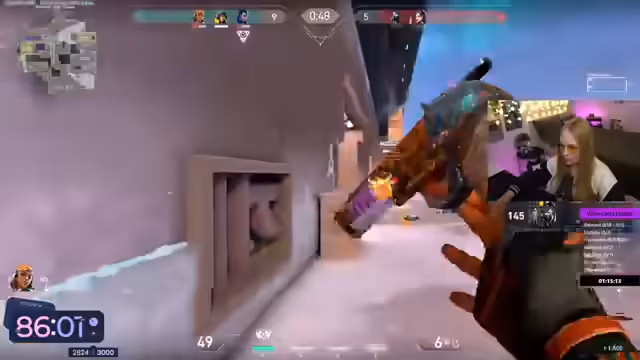 15:46:39Nach der kleinen Unterbrechung kehrt der Fokus zurück zum laufenden Valorant-Spiel. Es geht nun um das Erkennen und Nutzen von taktischen Vorteilen. Der Streamer beobachtet die Füße eines Gegners durch eine Wand, was als entscheidender Vorteil gewertet wird. Die Kommunikation zielt darauf ab, diese Information für einen überraschenden Angriff auf dem B-Sektor zu nutzen und den Gegner zu eliminieren.