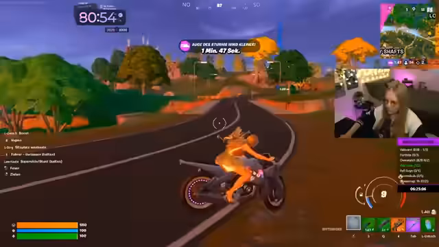 18:12:18Nach den Overwatch-Spielen wechselt die Streamerin zu Fortnite. Es wird über ihre langjährige Erfahrung mit dem Spiel gesprochen und eine Runde gespielt, die von Spannung, Jagd auf Gegner und der Jagd nach Beute geprägt ist. Parallel dazu entwickeln sich ausufernde, humoristische und absurte Diskussionen über Alltagsthemen, wie die Hygiene bei Blinden oder die Badegewohnheiten der Römer.