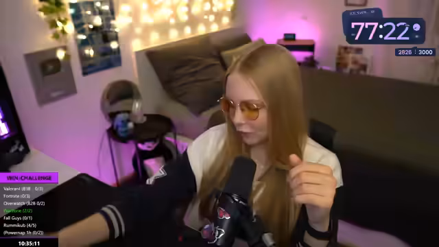 11:11:42Die Streamerin gibt an, nach nur drei Stunden Schlaf wieder live zu sein, da sie 26 Stunden wach war. Dies war notwendig, da sie sich in einer Schaf-Warzone-Zock-Challenge befindet. Sie ist gelaunt, aber hungrig und stellt fest, dass sie den Schlafrhythmus nicht mehr checkt, was für die Streamerinnen typisch zu sein scheint.