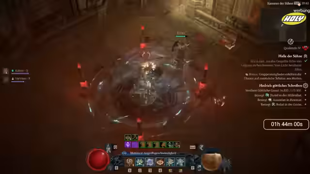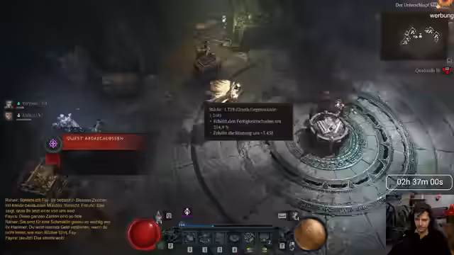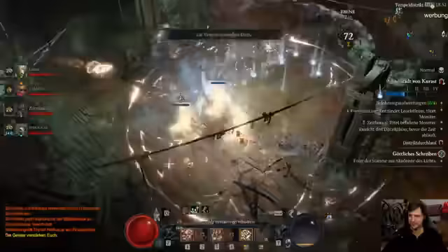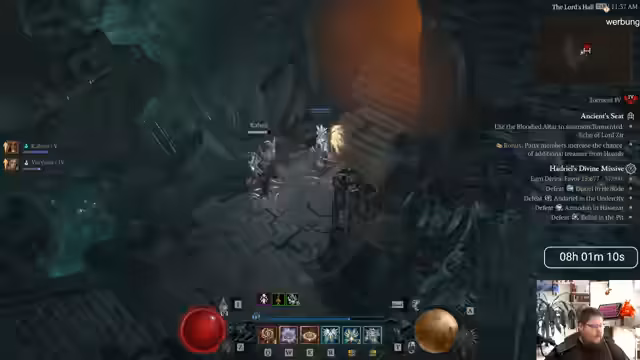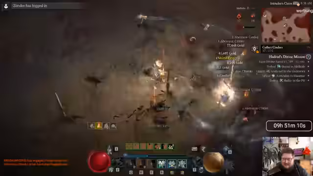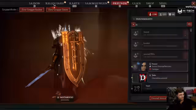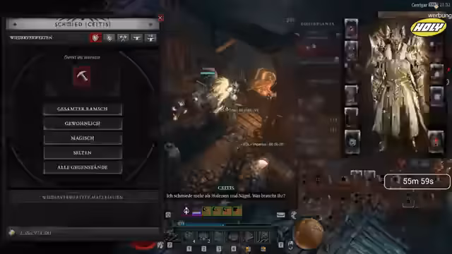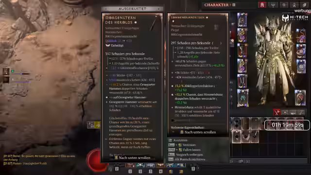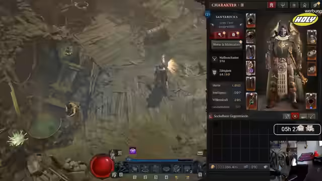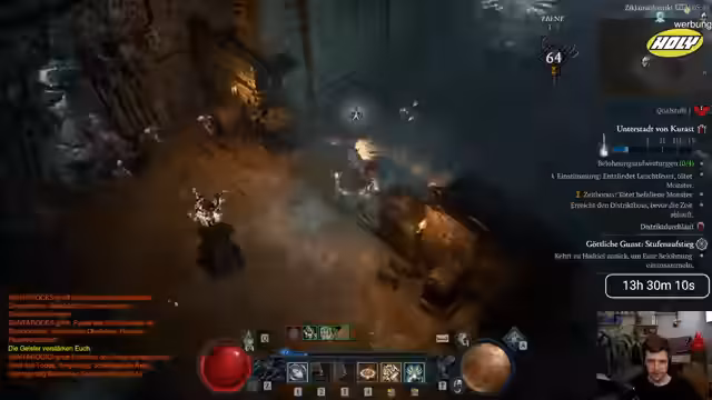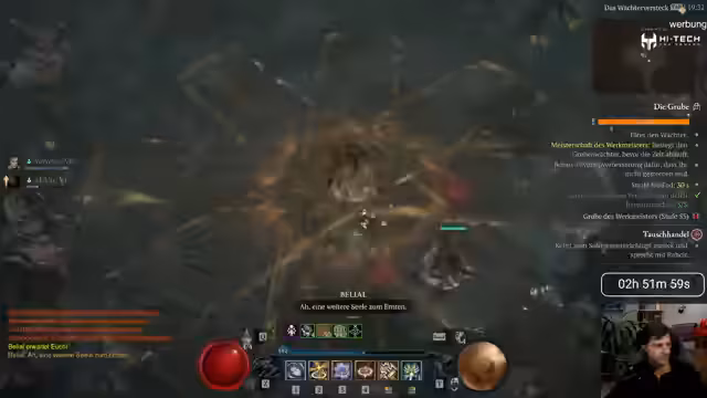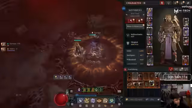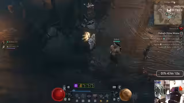 15:03:16Der Streamer farmt Prosser und diskutiert Mats. Er optimiert seinen Hammerdin-Build mit dem Bruder Neko und erwähnt, dass er ohne Pali zum Neko geworden wäre. Es geht um Waffen wie Feuereifer und Opus, die XP von Bossen und die Wichtigkeit der richtigen Waffe. Später kämpft er gegen den Kommandant der Höllenflut und Lord Seher. Er erklärt seine Spielweise mit dem Erzeuger für Buffs und Teleport für Speedfarmen, sowie Ultimate-Anpassungen mit Wing of Sun of Skies und Cooldown-Management.
