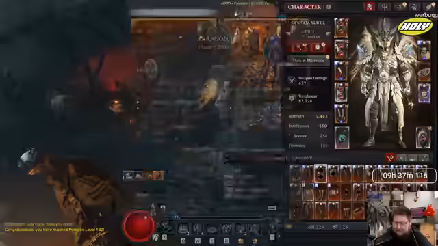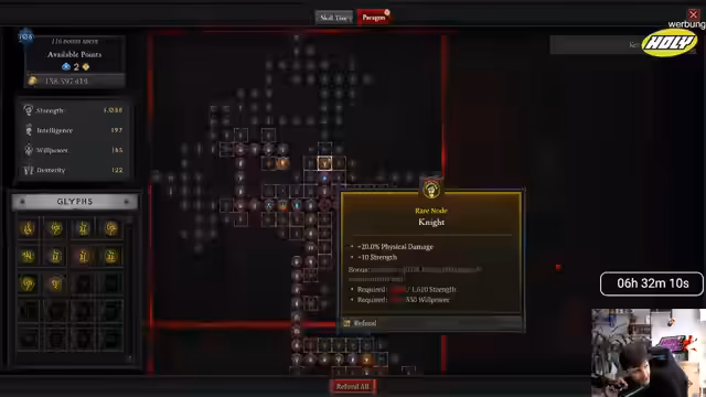 00:31:20Der Streamer demonstriert, wie der Paladin durch einen nicht gecappten Paragon-Knoten (Castell) übermächtig wird: Der Rüstungs-Multiplier von 616% erhöht den Schaden exponentiell, wodurch die Aura des heiligen Lichts Millionen Schaden verursacht. Er erklärt, dass dieser Fehler bereits beim Spiritborn auftrat und wahrscheinlich gefixt wird, aber aktuell jeden Paladin dominant macht. Der Build nutzt Auren wie Fanatismus und Trotz, und selbst ohne Schildwurf wird der Inhalt einfach bewältigt.