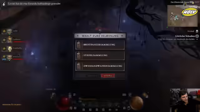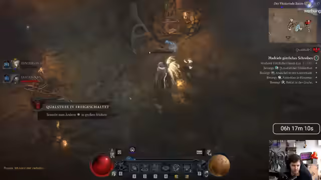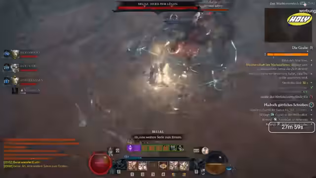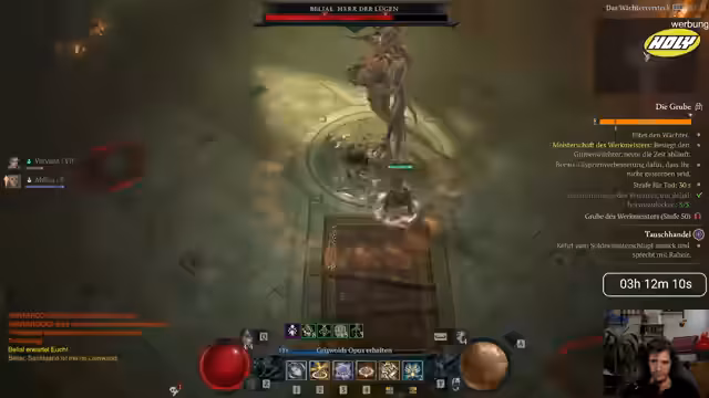 13:06:40Die Gruppe betritt einen Dungeon und besiegt Bosse wie Asmodan, während sie über die Loot-Mechaniken sprechen. Sie erklären, dass Boss-Kisten nur durch das Einlegen von Materialien geöffnet werden können, was ein Team-Erfordernis ist. Es folgt eine Diskussion über zukünftige Klassenupdates, wobei die Amazone und der Hexendoktor als mögliche neue Klassen genannt werden. Die Spieler tauschen sich über ihre Erfahrungen mit vorherigen Seasons aus und heben die Stärken des Paladin-Gameplays hervor, während sie gemeinsam gegen Gegner vorgehen.