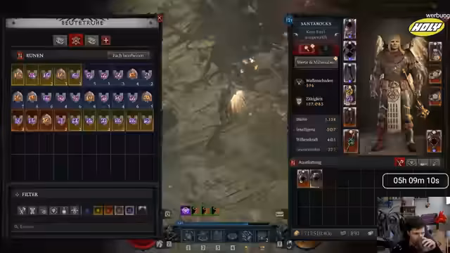 09:16:28Der Streamer optimiert seine Ausrüstung, darunter ein Triple-GA-Harlekin-Kopfstück. Er diskutiert Enchanting-Optionen, um Stats wie Abklingzeit (CDR), Rüstung oder Heilig-Schaden zu verbessern. Dabei stellt sich heraus, dass bereits vorhandene Greater Affixes beim Aufwerten überschrieben werden können. Er entscheidet sich für CDR als prioritären Stat und setzt Runen wie Igni und Gar. Die Optimierung zielt auf maximale Effizienz für den Paladin-Build ab.