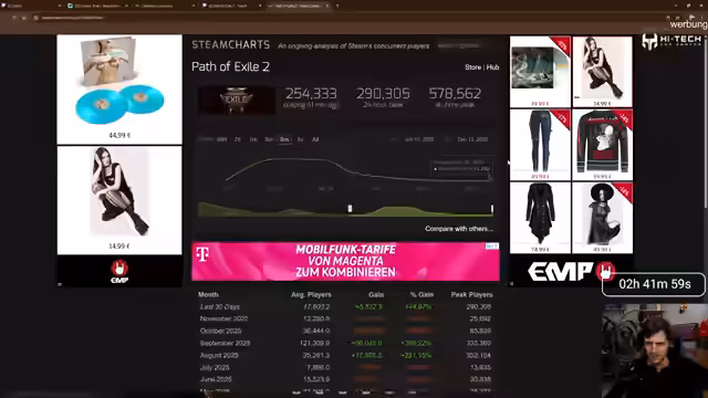 13:54:54Es folgt ein detaillierter Vergleich zwischen Diablo 4 und Path of Exile, insbesondere im Hinblick auf deutsche Zuschauerzahlen. Der Streamer erklärt die Querfinanzierung im deutschen PoE-Segment und die Schwierigkeiten, hohe Zuschauerzahlen zu erreichen. Aktuelle PoE-Spielerzahlen werden mit 290.000 Spielern bei einem Free Weekend diskutiert, was als enttäuschend empfunden wird. Die Gruppe plant, PoE am nächsten Tag zu spielen, um der deutschen PoE-Community mehr Sichtbarkeit zu geben.