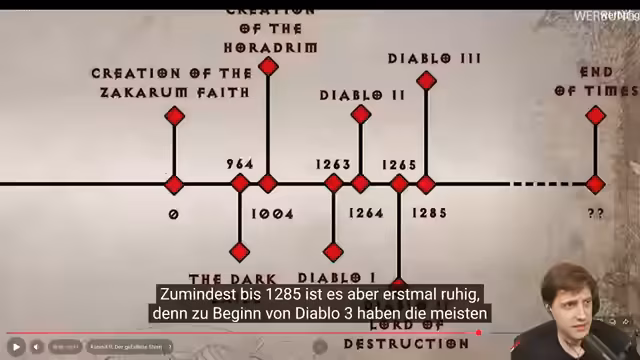 01:05:46Diablo 3 beginnt 20 Jahre später mit dem Absturz des Gefallenen Sterns, der Deckard Cain tötet. Die Helden helfen Tyrael, dem gefallenen Erzengel, und decken die Verschwörung von Adria auf, die ihre Tochter Leia opfert, um Diablo wiederzubeleben. Nach Diablos Tod in Diablo 3 kehrt in der Erweiterung Reaper of Souls der Engel des Todes Malthael zurück. In Diablo Immortal, das zeitlich zwischen Diablo 2 und 3 spielt, versuchen die Spieler, die Splitter des zerstörten Weltensteins einzusammeln.
