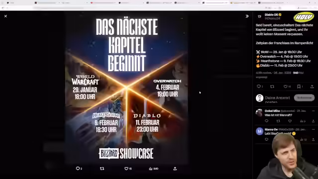 Es wurde auf ein bevorstehendes Treffen mit Blizzard verwiesen. Für Diablo werden am 11. Februar um 23 Uhr wichtige Ankündigungen erwartet, die als riesige Überraschungen für Fans beschrieben werden. Zusätzlich wird ein Jubiläum-Stream zum 10-jährigen Twitch-Partner-Jubiläum angekündigt.