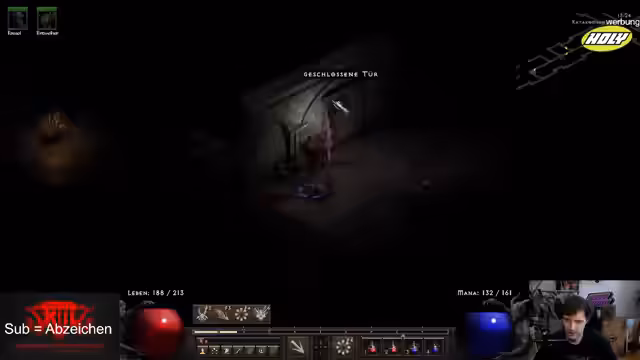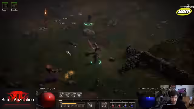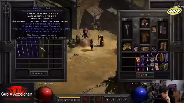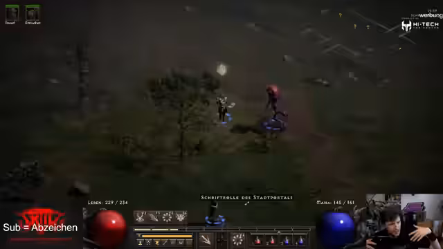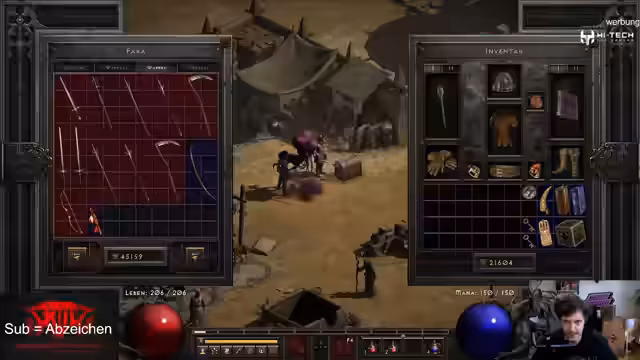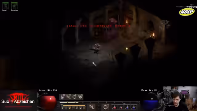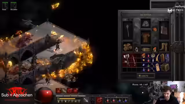 01:47:38Zu Beginn des Streamsegments wird intensiv an der Ausrüstung des Warlocks gearbeitet. Nach dem Tod im Kampf gegen Duriel wird die Ausrüstung repariert und beim Händler im Keller optimiert. Der Streamer farmt in den Katakomben nach Runen, um ein Runenwort für eine leere Brustplatte zu vervollständigen. Es werden zwei Runen, Tal und Eth, gefunden und in eine Lederrüstung eingesetzt, um das erste Runenwort zu zaubern, was dem Charakter Giftwiderstand verleiht.