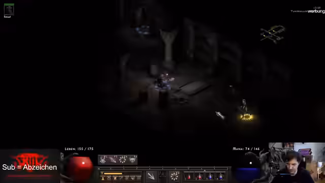 03:21:45Während die Community noch Zeit hat, am Giveaway teilzunehmen, setzt der Streamer das Gameplay in den Katakomben fort. Es werden weitere Ebenen des Turms (Tower) absolviert und aktiv nach Runen und guter Beute gesucht. Die Suche ist erfolgreich, da ein Doppel-Runen-Drop gelingt. Der Streamer nutzt die Zeit, um seine Zuschauer zur Teilnahme aufzufordern, und betont, dass der Gewinner in wenigen Minuten gezogen wird.