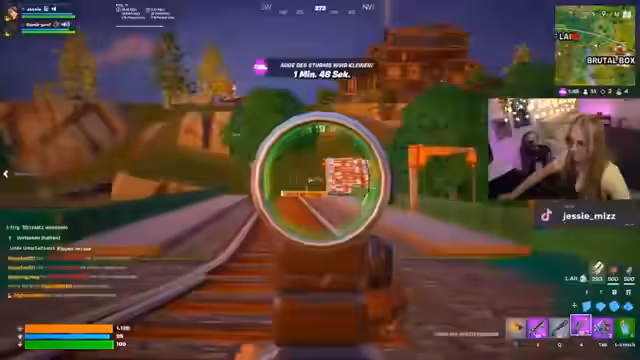 01:41:00Zu Beginn des Streams konzentriert sich Streamerin Jesse auf das Spielen von Fortnite. Sie berichtet über Verwirrung bezüglich ihrer Ausrüstung und stellt fest, dass sie eine Waffe in der Hand hält, die sie zunächst für eine Shotgun hält, die sich aber als andere Waffe herausstellt. Während des Spiels werden ihre Teammates ausgeschaltet, was zu strategischen Schwierigkeiten führt. Die Konzentration liegt auf der Identifizierung von Waffen und dem Versuch, Karten und Gold aufzusammeln, wobei sie mehrfach über fehlendes Gold und den Kauf von Autos klagt, was zu humorvollen und frustrierenden Momenten im Spiel führt.