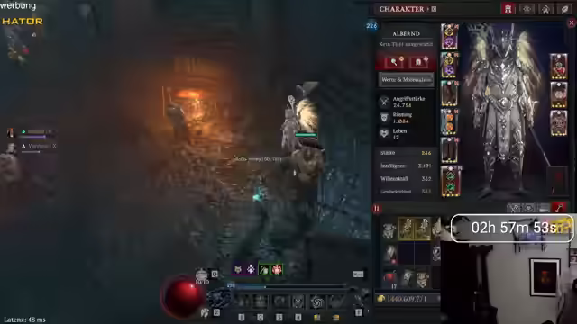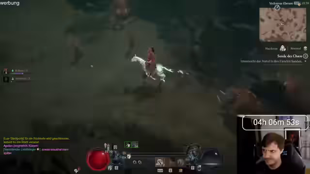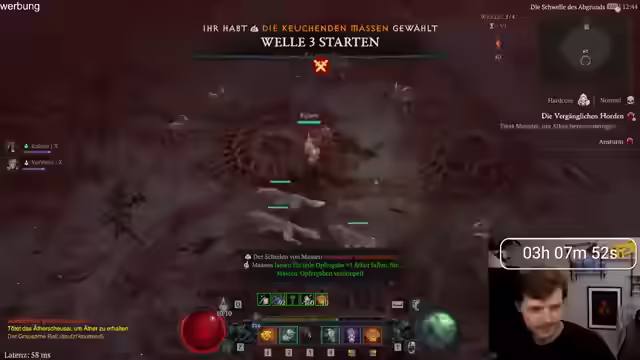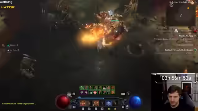 02:46:42Es wird diskutiert, ob Helltide schneller wäre, aber die Chaos-Rüstungen haben keine Levelbegrenzung, sondern eine Level-28-Begrenzung wie mythische Items. Der Stream läuft weiterhin, trotz technischer Trennung durch Twitch nach 48 Stunden. Es wird erklärt, dass Operation Waldfee ins Leben gerufen wurde, um mit dem Mage Kisten zu farmen und ein mythisches Item über den Funken zu erhalten. Es wird die Möglichkeit erwähnt, mit 90 Schriftrollen einen Drink zu machen, einen Funken zu holen und wieder 90 Schriftrollen zu farmen, um unendlich viele Funken zu erhalten. Die Krümmung in den Chaos Dungeon wird als schnellste Methode angesehen. Es wird erklärt, dass man durch die Chaos-Portale Funken erhält und Schlüssel für weitere Portale findet. Das Farmen dient dazu, mythische Items zu erhalten und einen Drink mitleveln zu können. Es werden 90 Krümmungen benötigt, und es wird erklärt, wie man diese gegen Schriftrollen tauscht. Das Farmen dient nicht nur der Waldfee, sondern auch dem Freischalten des Boards und dem Erhalt eines Funkens. Es wird erwähnt, dass der Druide bereits Level 32 ist und eine Doppel-GA-Chaos-Rüstung trägt.