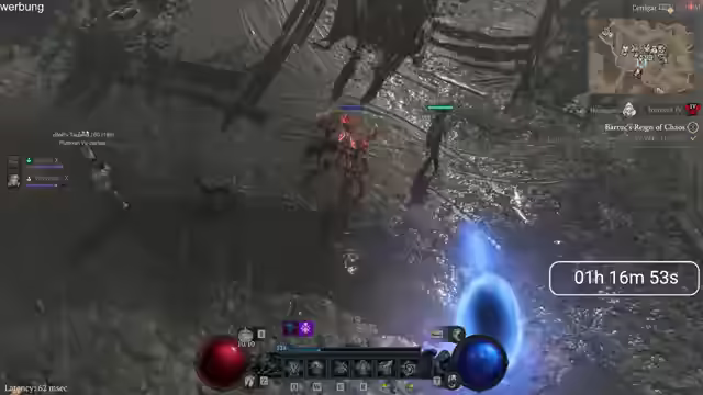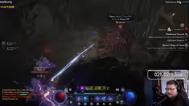 02:12:01Es wird getestet, ob das Season Board früher nutzbar ist, auch ohne viele Quests abgeschlossen zu haben. Es wird festgestellt, dass man das Board selbst noch nicht nutzen kann, aber Schriftrollen genommen und durchgedrückt werden können, um mythische Funken zu erhalten, ohne diese freispielen zu müssen. Operation Waldfee erweist sich als voller Erfolg, da ein Chaos-Item gefunden wird, das sogar in der Levelphase angezogen werden kann. Es wird überlegt, ob noch etwas auf der Tafel ist und festgestellt, dass man einfach durchklicken und sich mit einem Drink einen Funken holen kann. Der Talisman des verbrannten Fürsten wird erwähnt, der nach Ressourcenverbrauch die überwältigte Kernfähigkeit verstärkt. Es wird kurz AFK gegangen, um Chasool die neue Operation Waldfee zu erklären. Die Frage kommt auf, wie man am schnellsten zur Höllenkrümmung gelangt, wobei NMDs mit Chaos-Affixen als beste Option angesehen werden. Ein Chaos-Portal wird geöffnet, um zu sehen, wie viel man dort erhält. Es wird überlegt, ob Helltide schneller wäre, aber Chaos Dungeons scheinen effizienter zu sein.