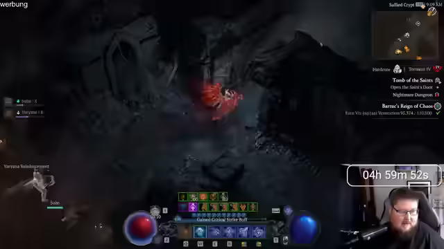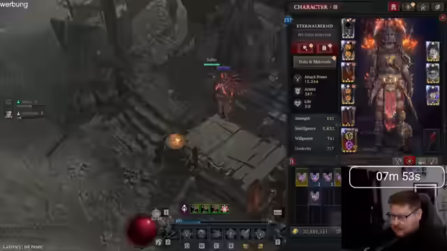 03:50:51Es werden sportliche Übungen im Stream eingebaut. Es wird gefragt, wie viel Diablo in den Zuschauern steckt. Es werden die Stunden reiner Farmzeit verglichen. Es wird gesagt, dass Sonntag ein Disconnect-Tag ist. Es wird nach einem Portal gesucht. Es wird erklärt, was ein GA ist (Greater Affix). Es wird erklärt, wie man Höllenkrümmung Ruf farmt, um Schriftrollen zu holen und diese auf dem Trink einzulösen. Es wird erklärt, wie man die Schriftrollen bei dem Händler einlöst und auf die Bank legt. Es werden die zwei Chaos Rüstungen geholt. Es wird erklärt, wie Geheimprojekt Waldfee funktioniert. Es wird gesagt, dass der Druide mit Level 30 mehr Gear hat als voll-equipten Charaktere. Es wird gesagt, dass das der Deal von Geheimprojekt Waldfee ist. Es wird gesagt, dass die Brustplatte GA ist.