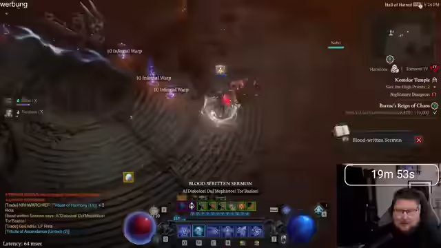 03:40:12Es wird erklärt, wie man die Drops im Spiel einfordern kann, die man durch das Zuschauen auf Twitch erhalten hat. Der Timer hat immer noch nicht angehalten. Es wird ein Mob übersehen, der nicht reinkommt. Es wird berechnet, wie viele Kisten noch benötigt werden. Es wird nach einem Portal gesucht. Es wird gesagt, dass bis jetzt noch kein mythisches Item gefunden wurde. Es wird gehofft, dass Blizzard das Decken der Baumbelohnungen modifiziert. Es werden die Sabaton-Session seit Freitag erwähnt und dass das Ganze langsam ein Ende findet. Es wird über einen Hard Stop nachgedacht, da bald die neue Arbeitswoche beginnt. Es wird erwähnt, dass seit Season Start 80 Stunden lang gestreamt wurde. Es wird gesagt, dass Mr. Morgan 379 Tage live war, aber das nicht das Ziel ist. Es wird erklärt, dass man den Level-Build später umstellen kann. Es werden die 6000 Krümmung erwähnt. Es wird gesagt, dass es in den Städten eine Schwierigkeitsstufentabelle gibt und dass man die Qual-Stufen freispielen muss. Es wird gesagt, dass der Fuß eingeschlafen ist.