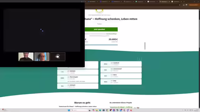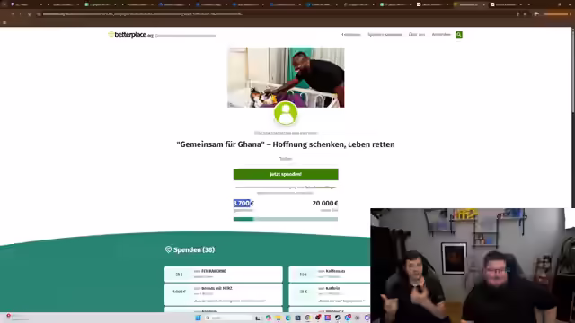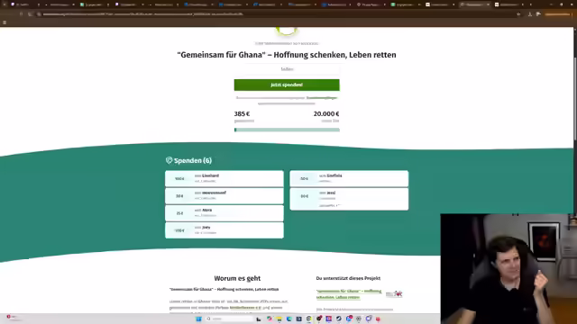 10:08:15Es wird ein PDF eingeblendet, das die Arbeit der Ärzte in Ghana erklärt. Die Ärzte arbeiten ehrenamtlich, aber es entstehen Kosten für Operationen (8.000 Euro pro OP), Katheter (3.000 Euro) und medizinische Geräte (50 Euro). Es wird betont, dass in Ghana das Leben von Kindern oft vom Preis einer Operation abhängt. Der Spendenlink "!Ghana" wird beworben, und es wird erwähnt, dass er bereits von einigen Zuschauern getestet wurde. Am Ende des Streams werden zusätzlich 500 Euro mit dem Namen "Bernd mit Herz" gespendet. Es wird dazu aufgerufen, Fragen zum Projekt zu stellen, da der Initiator, ehemalige Fußballer und Ärzte anwesend sind.