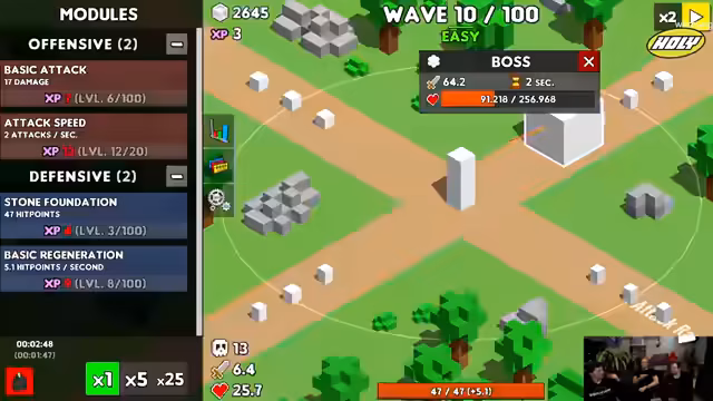 01:23:18Es gibt Bosse, die Ressourcen-Checks erfordern. Module können freigeschaltet und geupgraded werden. Der Boss-Kampf wird mit Pfeiltasten gesteuert, eine Energieleiste muss durch das Sammeln grüner Bälle aufgefüllt werden. Verschiedene Tiers bieten neue Fähigkeiten. Achievements, wie das 'Spring-Me-Ride-Round' bei perfektem Timing, sind enthalten. Idle-Elemente erlauben Offline-Produktion bis zu einer Woche.