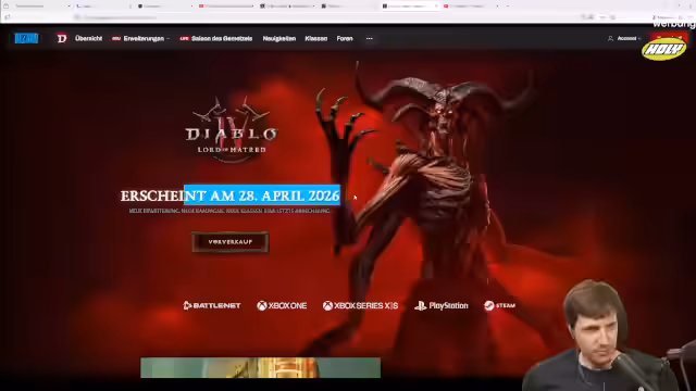00:14:52Der Streamer gibt Informationen zum bevorstehenden Diablo 4 Add-on, das am 28. erscheinen soll. Er fragt nach einer genauen Uhrzeit für den Release in Europa, erhält jedoch nur die unklare Antwort 'round about midnight'. Er erwähnt, dass das Add-on-Team wahrscheinlich noch an den letzten Feinschliffen arbeitet und meint, dass Blizzard solche Details zwei Wochen vorher wissen sollte. Er äußert auch Bedenken darüber, wie Blizzard das Add-on vermarktet, insbesondere im Vergleich zu Diablo Immortal.