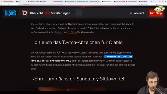 00:11:40Eine große Verwirrung herrscht um das Datum und die Uhrzeit des bevorstehenden Diablo-Events am 11. Februar. Der Streamer findet mehrere widersprüchliche Zeitangaben vor: 14 Uhr im Battle.net Launcher, 19 Uhr in einem offiziellen Trailer und 23 Uhr, die er für die korrekte hält. Diese wiederholten Fehler bei der Kommunikation der Eventzeiten sorgten für Verwirrung und sorgen für die Frage, ob sich das Event für die Community lohnt.