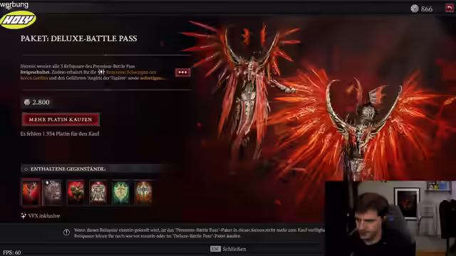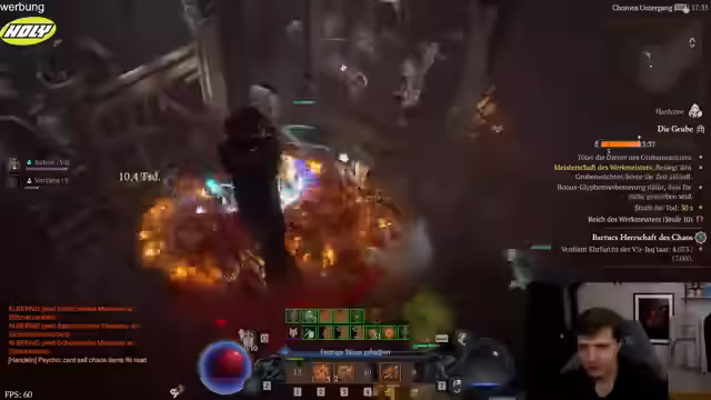08:49:06Es wird ein Battle Pass verlost. Um daran teilzunehmen, soll man einmal folgen und "BB01" in den Chat schreiben. Die Verlosung ist nur für PC-Spieler. Es wird an der Hardcore Challenge mit der Community teilgenommen, da vor 22 Stunden die neue Season gestartet ist. Das Max-Level wurde erreicht und es wird versucht, auf Qual 1 zu spielen, um die neuen Chaos-Rüstungen zu bekommen. Was diese genau machen, wird sich noch zeigen. Es wird vermutet, dass die Chaos-Rüstungen in den Infernal Horts droppen, aber das ist wahrscheinlich noch zu heavy. Es wird darauf hingewiesen, dass die Chaos-Rüstungen nicht verkauft werden können. Außerdem wird ein Rabattcode für Holi erwähnt: Einfach "Jesse" oder "Jesse Rock" bei Bestellungen eingeben. Morgen um 12 Uhr gibt es die Holy Advent Kalender. Es wird überlegt, ob auf Ball Lightning umgeskillt werden soll.