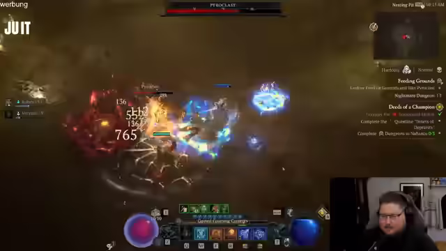 03:15:54Es wird die Steuerung des Charakters in D4 und PoE 2 verglichen, wobei beide als gut empfunden werden, aber eine Umgewöhnung nötig ist. Es wird gefragt, welche Pets beim Einsammeln helfen, woraufhin erklärt wird, dass alle ausrüstbaren Pets dies tun. Der Shop wird nach schönen Inhalten durchsucht und Rewards werden abgeholt. Es wird über Chaos Armor und Chaos Rifts gesprochen. Die Karotte von D4 wird vermisst und ein belohnenderes Endgame gewünscht. Es wird diskutiert, dass das Endgame verbessert werden muss. Es wird über das Überbieten des Pit gesprochen. Der Streamer ist noch nicht Level 60 und hatte am Anfang Probleme mit Chaos-Portalen. Es wird nach der Klasse und dem Build der Zuschauer gefragt. Leaderboards werden gewünscht. Ein Spiritborn wird erwähnt. Es wird über den Stronghold Alkanus gesprochen. Frischer Kaffee und Mittagessen werden erwähnt. Ein Zuschauer hat sein erstes Chaos-Item aus der Helltide bekommen. Strongholds lohnen sich wegen Gebiets-Renown. Es wird über die Kampagne als effektiven Weg zum Leveln gesprochen. Der Streamer ist fast Level 60.