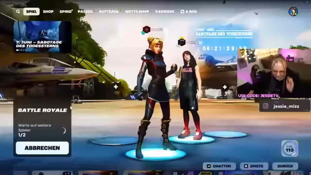 01:38:20Eine Fortnite-Spielrunde beginnt in Duo, wechselt aber zu Solo, da kein dritter Mitspieler online ist. Es gibt Probleme mit der Lobby-Suche, die bis zu 15 Minuten dauern kann, was auf wenige aktive Spieler schließen lässt. Während des Wartens werden verschiedene Skins und der Shop betrachtet, insbesondere ein Lamborghini im dunklen Rot. Auch Rocket-League-Skins werden als Alternative erwähnt und die Suche nach einem Game dauert weiterhin an.