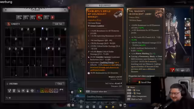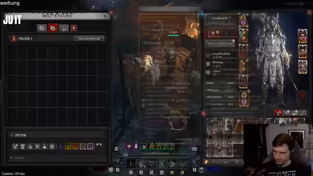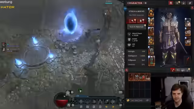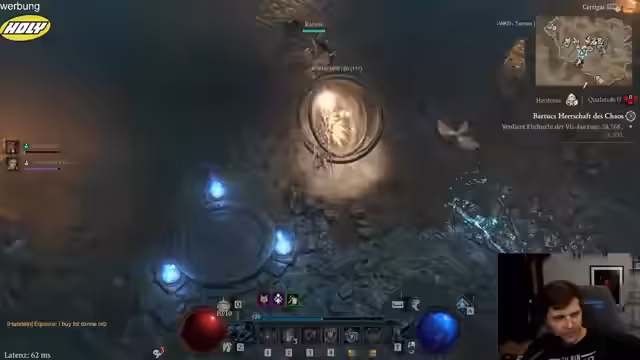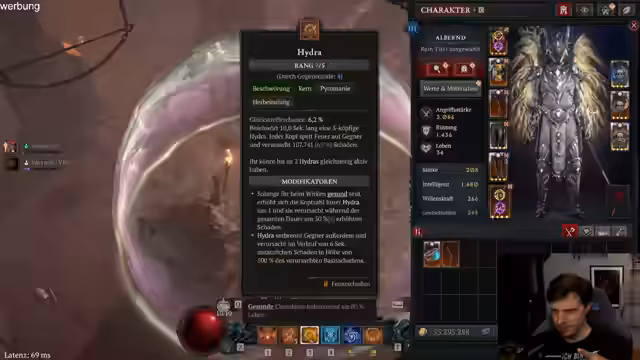 02:52:33Es kommt zu einer Unterbrechung, da der Streamer in den Weinkeller gehen muss. Nach seiner Rückkehr konzentriert er sich auf das Spiel und führt eine Skill-Änderung durch. Er wechscht vom Lebens- zum Manaschild, da er sich mit dem halben Leben unwohl fühlt. Die Community gibt ihm Tipps bei der Item-Proggen und er erkundigt sich nach der Herkunft der legendären Höllenhorde, die man aus den Kisten des Flüsterbaums oder den roten Höllenfluten-Regionen erhält.