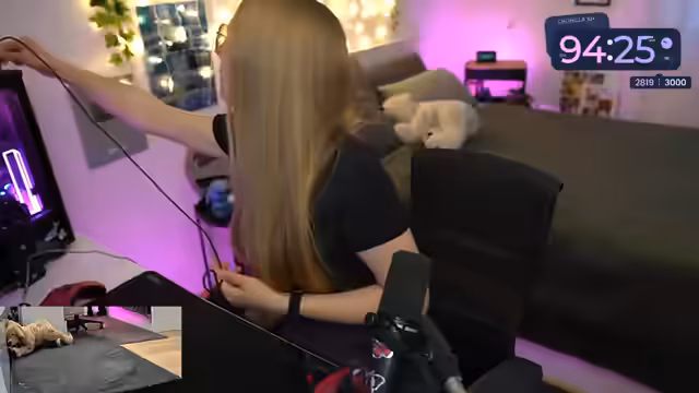 05:53:30Der Stream startet mit Begrüßungen und kurzen persönlichen Abläufen. Die Streamerin erwähnt, dass sie sich noch frisch rasiert und eingecremt hat und sich auf den Stream vorbereitet. Sie testet das Mikrofon und den TTS-Zugang und bittet die Zuschauer um Hilfe bei der Aktivierung des Timers. Es herrscht eine lockere, entspannte Atmosphäre während die Streamerin für den Abend bereit macht.