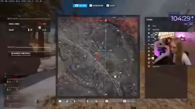 04:49:43Die Streamerin befindet sich in einem intensiven Kampf in der Sperrzone und erkundet verschiedene Orte wie einen Park, ein Feuerwehrhaus und einen Hangar. Sie meldet mehrere Gegner, Kooperationen mit Teammitgliedern und strategische Bewegungen. Dabei geht es um das Aufspüren und Ausschalten von Gegnern, um Loot zu sammeln und die Zone zu überleben. Sie wechselt ständig zwischen nahem und fernem Kampf und nutzt Drohnen zur Aufklärung.