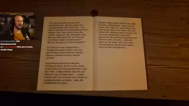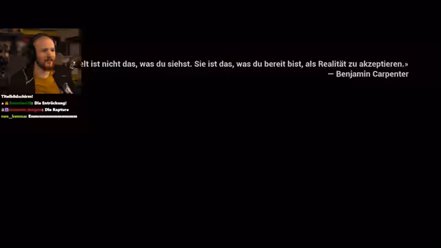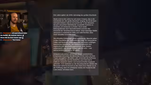 03:58:28Der Streamer liest eine Notiz, die das „große Verschwinden“ thematisiert, ein Ereignis, das die Menschen mit Trauer und Verwirrung zurückgelassen hat. Es gibt verschiedene Erklärungen, von einem schrecklichen Urteil bis zu einem zufälligen kosmischen Datenfehler, wobei mystische und Verschwörungstheorien am weitesten verbreitet sind. Diese Theorien bieten einfache Antworten auf komplexe Fragen und ziehen Menschen an, die mit ihrem Leben unzufrieden sind und ihren Unmut in Gesellschaftskritik äußern. Die Notiz betont, dass es keine einzige Antwort gibt und wahrscheinlich nie geben wird. Zum dritten Jahrestag des Ereignisses zünden Menschen weiterhin Kerzen an den Türen ihrer Häuser an, in der Hoffnung, die Finsternis der Leere zu vertreiben. Der Streamer benötigt dringend einen Schlüssel, um weiterzukommen, und hat das Gefühl, etwas übersehen zu haben. Er klickt vergebens auf Autos und sucht nach einem Ausgang, während er auf eine weitere Notiz stößt, die das „große Abschied“ als rätselhaftes Kapitel der jüngeren Geschichte beschreibt, dessen Umstände ungeklärt bleiben. Angehörige fordern weiterhin Aufklärung, und das Ereignis hat sich tief ins kollektive Bewusstsein eingeprägt. Die Welt wird nie wieder dieselbe sein, und es bleibt nur der Weg, in einer neuen Realität zu existieren, in der Fragen offen bleiben.