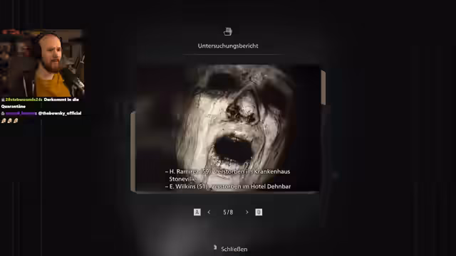 02:25:09Der Streamer entscheidet sich für einen gemeinsamen Start in 'Resident Evil 9: Requiem'. Nachdem die Schwierigkeit auf 'Modern' festgelegt wird, betritt die Spielfigur Grace das Hotel Renwood in Raccoon City. Die Ermittlungen beginnen, nachdem eine mysteriöse Leiche und einiges an Hinweisen gefunden wurden. Eine besondere Beziehung zur Mutter der Protagonistin wird durch ein Foto und einen Zeitungsartikel deutlich.